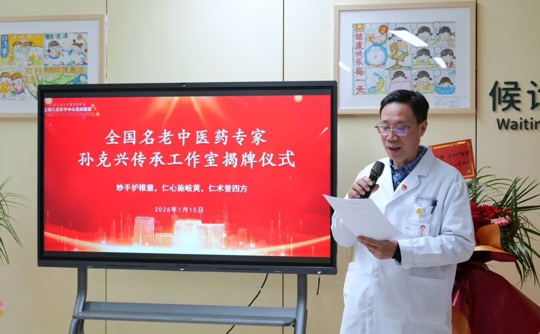 1月15日,全国名老中医药专家孙克兴传承工作室揭牌仪式在贵阳举行,工作室正式落户上海儿童医学中心贵州医院。此举旨在推动优质医疗资源下沉,提升贵州及西南地区儿童中医药医疗服务能力,为患病儿童提供更优质的中医药诊疗服务。医院陆奕副院长,石华副书记,杨燕贇总会计师出席揭牌仪式。