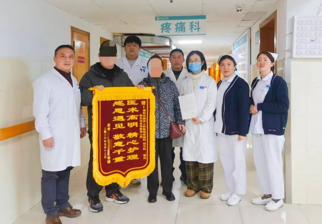 新年伊始,贵阳市第四人民医院(贵阳市骨科医院)疼痛科收到了一份特别的感谢——刚康复出院的林婆婆在儿子的陪伴下送来一面印着“医术高明精心护理 感恩遇见敬意千重”的锦旗和一封情真意切的感谢信,这也是疼痛科2026年收到的第一份来自患者及家属的特别谢意。