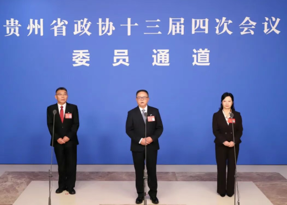 高鸿(中)在贵州省政协十三届四次会议第二场“委员通道”集体采访活动上接受采访