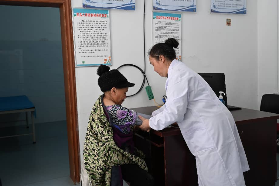 柏华丽在村卫生室为老人测量血压。