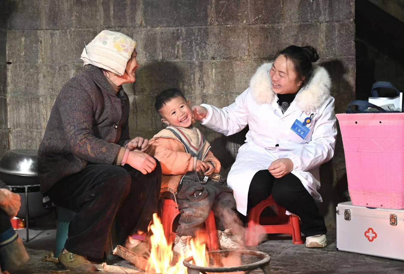 1月29日,村医柏华丽(右)在梁林保家,与梁林保母亲、儿子围坐火堆旁,笑意融融,满是温情。