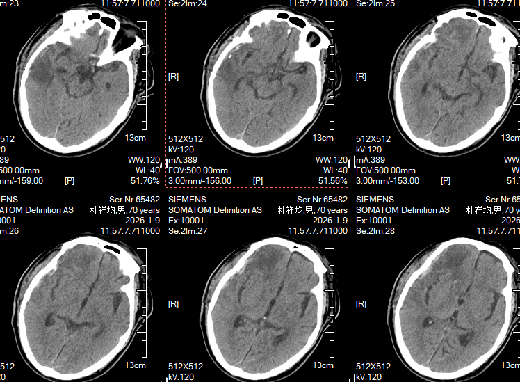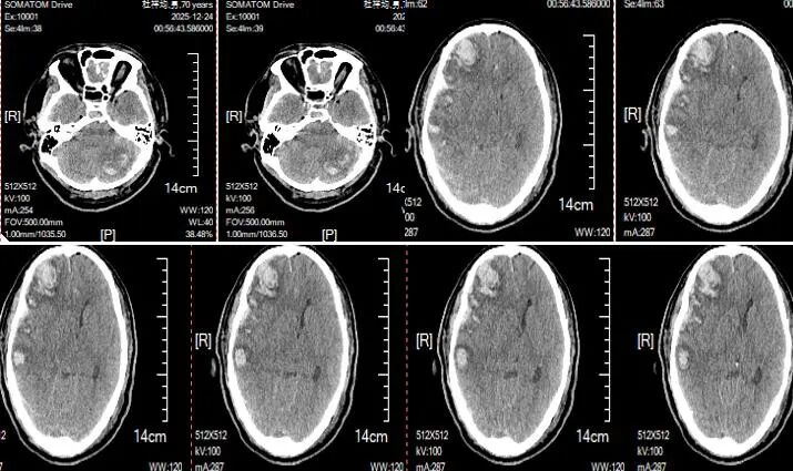 患者入院时已处于深昏迷状态,无自主呼吸,血压持续偏低,需依靠大剂量升压药维持;右侧瞳孔散大,提示脑疝形成,同时伴有严重创伤性休克、血氧饱和度仅82%,肋骨及骨盆多发骨折、双侧血气胸和腹腔脏器损伤等多系统损伤。神经外科重症监护室立即开启创伤救治绿色通道,在积极进行重症支持的同时,迅速完成相关检查与评估。