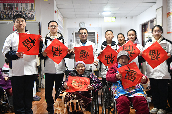 “向爷爷奶奶们拜年!”一声声清脆的问候响彻大厅。戴着鲜艳红领巾的少年们手持礼盒,有序走到轮椅前老人身边,将红袜子、毛巾等慰问品一一送到老人手中,鞠躬致意、送上祝福,老人们连声致谢,脸上满是笑意。