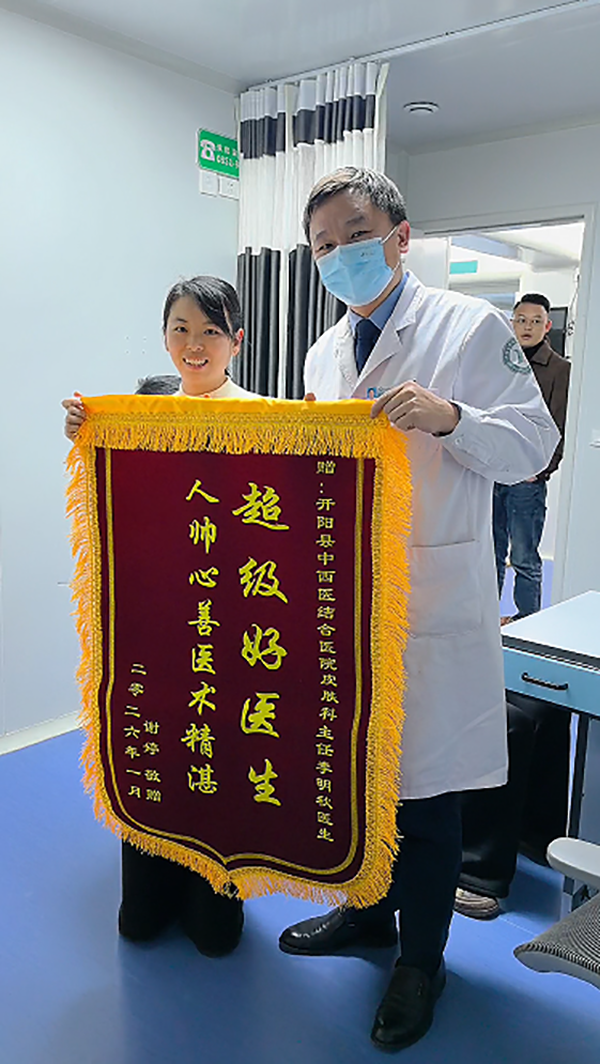 2月24日,是春节长假结束后的第一个工作日。当许多人还沉浸在节日的余韵中时,开阳县中西医结合医院的皮肤科诊室里却上演了暖心一幕。31岁的谢女士将一面印有“超级好医生·人帅心善医术精湛”的锦旗送到了李主任手中,用这面“不走寻常路”的锦旗,为医院的新年工作拉开了充满温情的序幕。