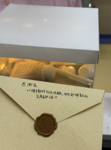 信笺来自一位刚刚经历开胸探查术康复出院的患者。米黄色信封上,火漆封印庄重而古朴。“罗主任的刀快又麻,王医师的关心与换药令人感动……”朴素的字句背后,是一场高难度手术的成功,更是一段漫长信任的延续。患者在卡片末尾深情补注:“我们一家30年前曾受到贵科室的帮助!!”