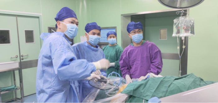 李文华同志(左1)指导学员为患者做手术