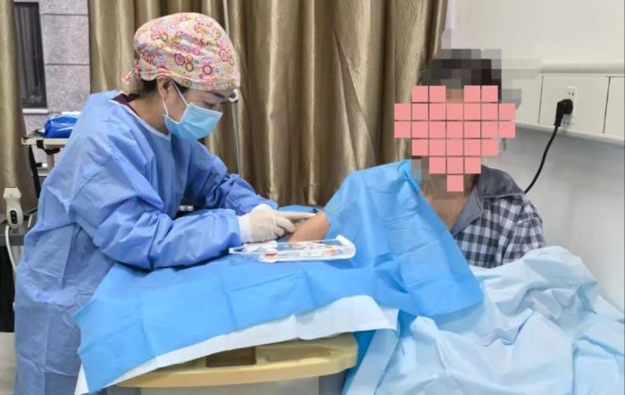 “常规的来不了,咱们就换法子!”肿瘤科静疗团队护士长吴霞的话,给团队吃了定心丸。第一步就是选穿刺的地方,下肢置管容易感染,还会影响患者日常活动;左边手臂血管条件稍好一点,但结合张叔叔的肿瘤位置,还有后续治疗、生活的方便性,团队最终决定选右上肢。