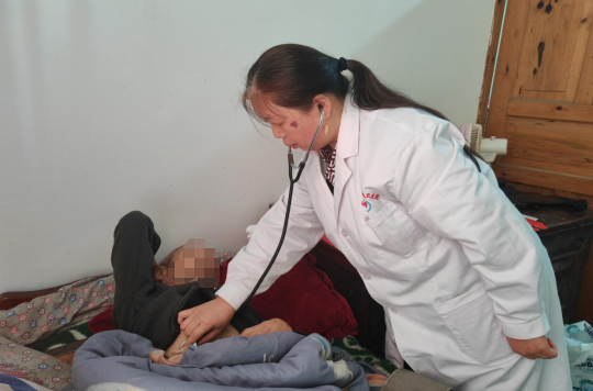 聊着聊着,我们就到了桐油坝组陈仕平老人的家。82岁的陈仕平老人患有腰椎病,又是高血压患者,行动十分不便。何碧容熟练地为老人进行身体检查,一边检查一边询问老人这段时间的身体状况。她仔细地为老人测量血压,询问是否按时服用降压药,还贴心地帮老人收拾放在凳子上的碗筷。尽管行动受限,但每次看到何碧容到来,陈仕平老人都会露出感激的笑容说着:“谢谢……谢谢……”