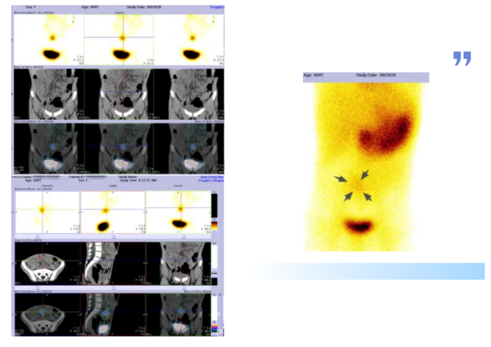 3月6日,从安抚哭闹患儿,到精确注射显像剂、摆放特殊体位、动态采集……每一环节严谨推进。图像清晰显示:彤彤的回肠末端出现异常放射性浓聚灶——正是异位胃粘膜!隐匿多年的病灶终于现形,彤彤被确诊为“麦克尔憩室”。