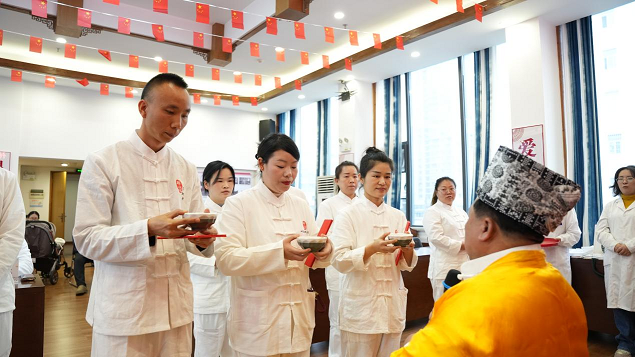 仪式现场,拜师环节极具苗医特色。王昌国严格遵循家族祖规,为徒弟们递上三碗冷水,以此传递行医做人的准则。“这三碗水,是我们王氏苗医传承百年的育人之道。”王昌国介绍,第一碗“冷水”,教徒弟学会接纳他人质疑,始终低调做人、务实行医;第二碗“苦水”,告诫徒弟学医之路无捷径,需勤学苦练,将汗水与泪水默默咽下;第三碗“甜水”,寓意行医之路先苦后甜,唯有坚守初心、深耕技艺,才能收获成长与认可。
