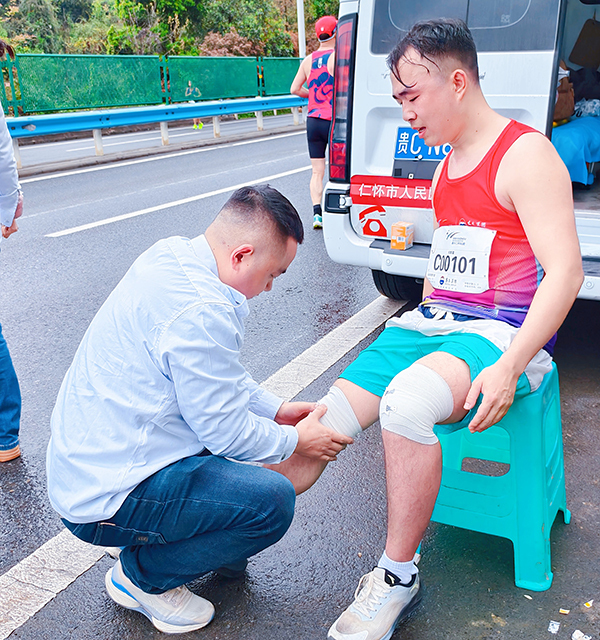 严谨专业的背后,是仁怀医护人的温情守护。他们不仅是应急救治的“守护神”,更是陪伴跑者前行的“暖心人”。为抽筋的选手进行专业拉伸,为擦伤的跑者细心包扎,为体力不支的参赛者递上温水和能量补给,一句句“加油”“您辛苦了”的鼓励,让奔跑的疲惫化为继续前行的动力。