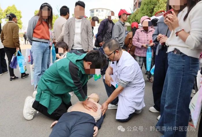 在急救技能培训环节,黔西南州中医医院急诊医学科医务骨干以模拟示教的方式讲解了心肺复苏术、海姆立克法等日常生活急救技能,让现场群众更好地提升自救互救能力。