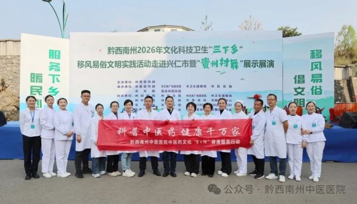 为深入推进中医药文化普及与健康惠民工作,助力基层精神文明建设,3月24日,黔西南州中医医院受邀参加黔西南州2026年文化科技卫生 “三下乡” 推进移风易俗文明实践活动走进兴仁市暨 “贵州村舞”展示展演系列活动,并在现场设立健康义诊区,为群众送上优质、便捷、专业的中医药健康服务。