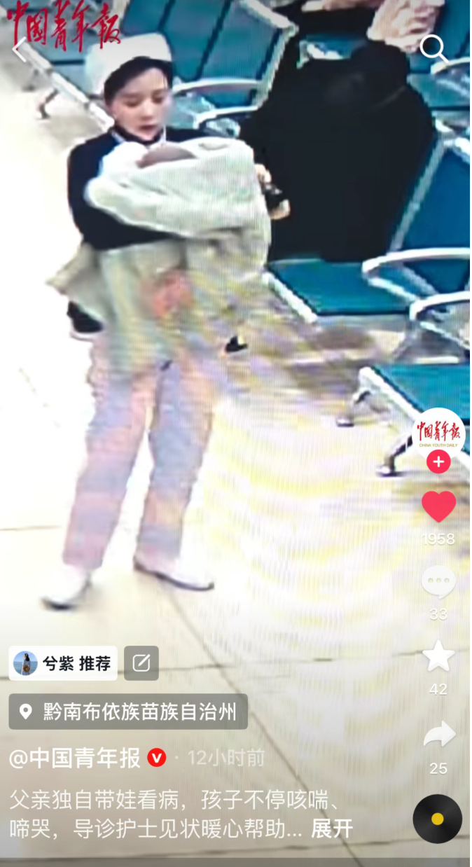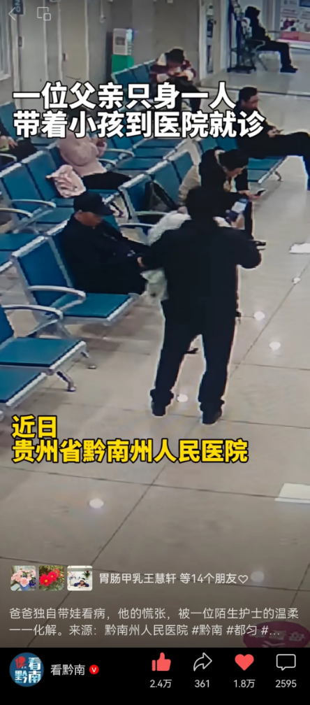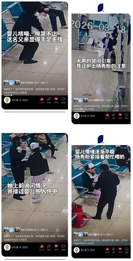 事发于医院门诊日常,一位父亲独自带着患病孩子就医,孩子因不适不停哭闹,一时手忙脚乱、焦急无助。导诊护士杨秀盼看在眼里、主动上前,全程化身暖心帮手,细心安抚哭闹的孩子,耐心引导完成全流程,细致周到地帮其解决就医途中的各类难题,用温柔与担当,缓解了患者家属的慌乱,让诊疗过程充满暖意。