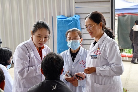 杨世霞穿梭在人群中,时而搀扶老人就诊,时而与医疗专家交流患者情况。她的手机响起,没有赶到的村民扯着嗓子的声音迸出听筒:“杨医生,你们等一下我嘛!”