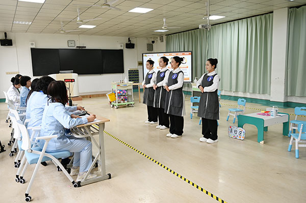 4月21日的竞赛现场,氛围热烈而紧张。参赛选手沉着冷静、操作娴熟,队内分工明确、配合默契,紧扣婴幼儿托育领域一线真实场景与实际问题,凭借扎实过硬的专业功底、严谨规范的职业态度从容应战。