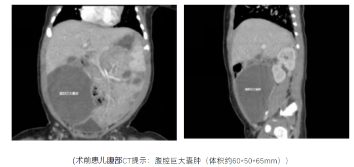患儿出生仅50天,因发现腹腔包块就诊,经检查提示腹腔巨大囊肿。因患儿月龄极小、腹腔空间狭小、包块来源性质不明,囊肿压迫或扭转易引发肠梗阻甚至肠坏死,传统开放手术创伤大、风险高,对术者技术与围手术期管理要求极高。