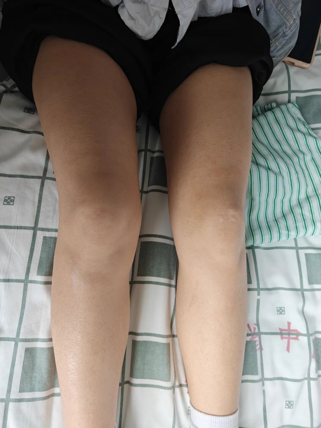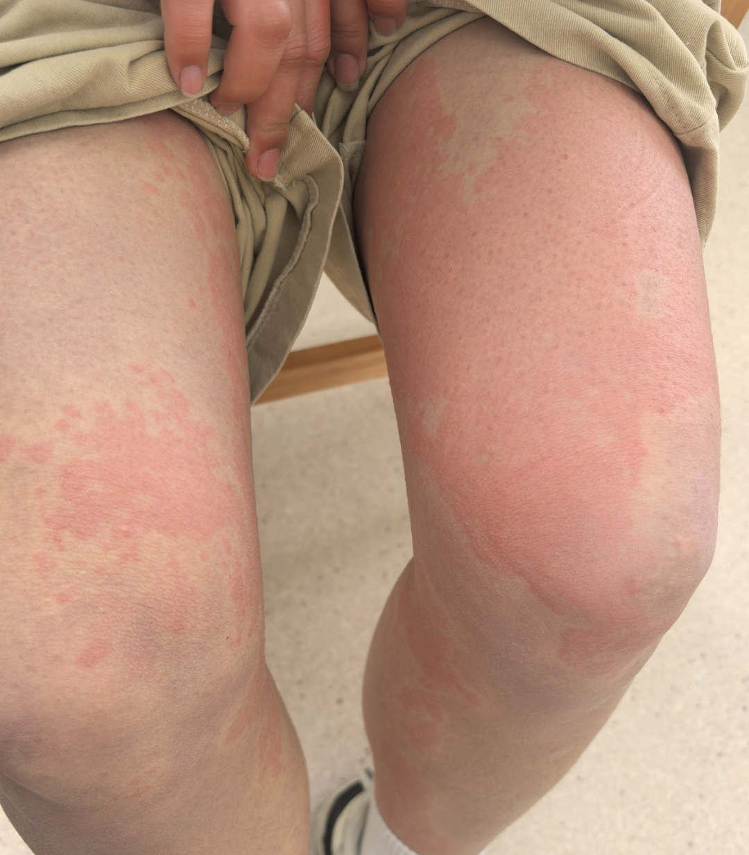 压力性荨麻疹:紧身衣物、久坐、背包带压迫后出现深层肿胀。