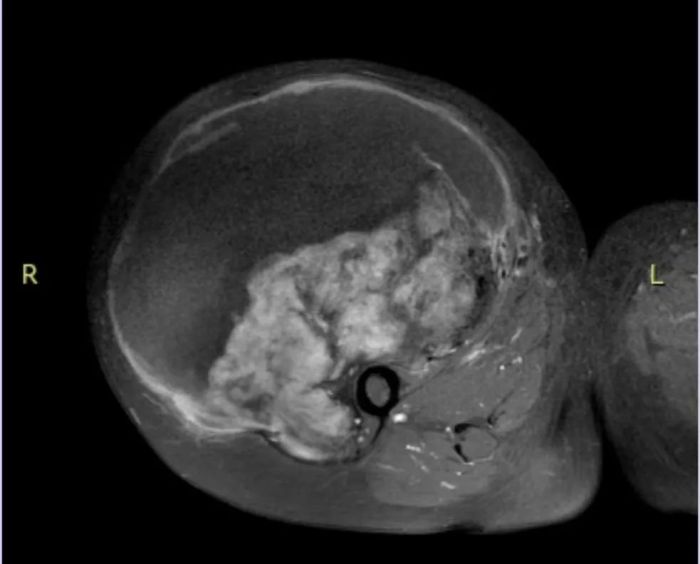 30年前,李阿姨发现右大腿内侧有一个约鸡蛋大小的肿块,行MRI检查后提示软组织肿瘤,因未出现红肿、疼痛等不适感,所以未进行手术。随着肿瘤逐渐长大,现已超过篮球大小,还伴有胀痛,使行走受限,严重影响了生活和工作,遂来到我院骨科就诊。