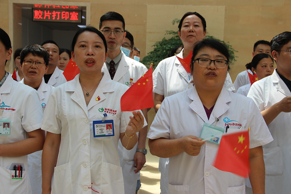 对谁都用心,对谁都是一样的亲,肩上的责任,驱动我一路前行,守护着生命,是我的天生使命......。中午12时,随着一曲《医者》的歌声,忙碌了一上午的医务人员从四面缓缓步入门诊大厅,共同宣誓:志愿献身人类的健康事业,自觉维护医学的尊严和神圣,敬佑生命,救死扶伤;平等仁爱,尊师重道;诚实守信,恪守医德;精益求精,慎思笃行;以上誓言,源于心,践于行。铿锵有力的宣誓声,坚定肃穆的神情,彰显了全体医务工作者积极投入医疗健康事业,服务患者的决心和使命。