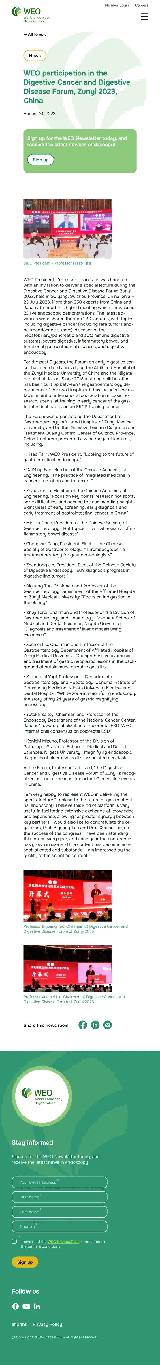 报道中,WEO主席田尻久雄教授对遵义医科大学附属医院消化内科庹必光教授、刘雪梅教授成功组织论坛表示祝贺。报道指出,“消化道癌及消化疾病遵义论坛”是中国消化病学领域重要的学术活动之一,为参与者提供了高水平的多学科国际交流。WEO期待能与“消化道癌及消化疾病遵义论坛”这类高水平消化领域伙伴合作,从而进一步提高消化病学的发展及消化内镜的诊疗标准和质量。世界内镜组织(WEO)于1962年在德国慕尼黑召开的世界胃肠病学大会期间成立,是全球消化内镜领域涵盖亚太、欧洲/地中海和美洲三个地理区域最具影响力的学术团体。此次报道意味着遵义医科大学附属医院消化内科获得国际关注,也让中国消化病学综合诊治能力赢得国际学界认可。