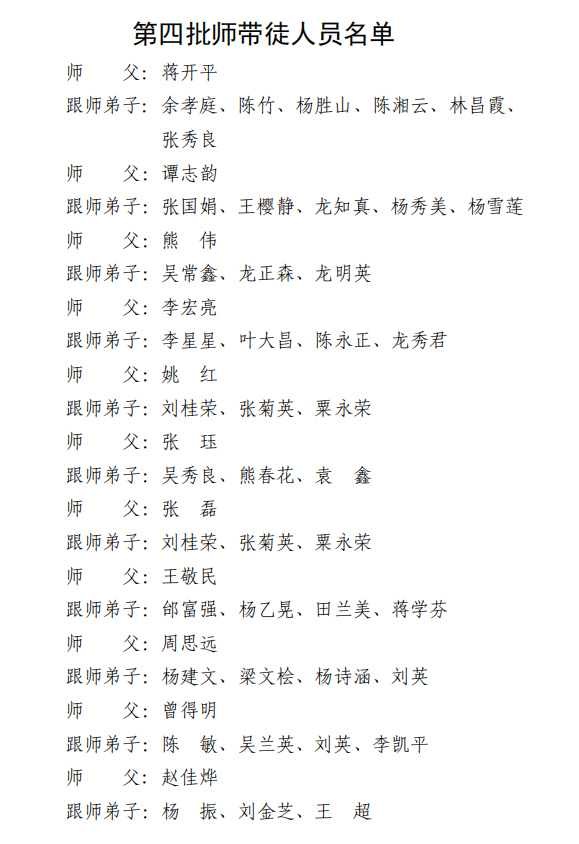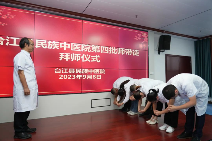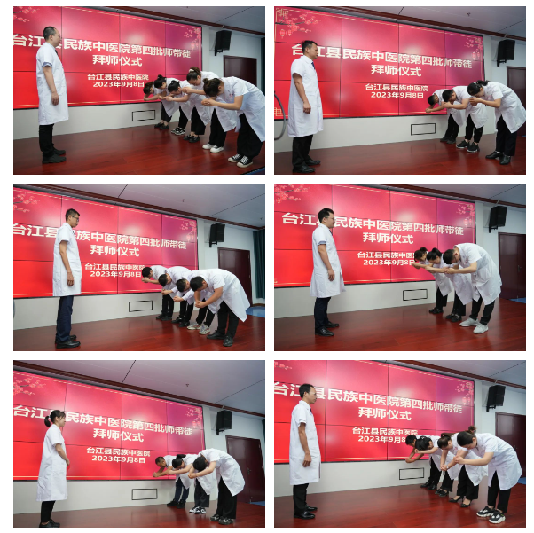 “素整衣冠、端身立正、拱手举过眉头,而后行三拜之礼,一拜师父收于门下,二拜师父传道、授业,三拜师父不厌其烦,谆谆教诲。礼成”。拜师仪式上,蒋开平院长与10位帮扶专家分别与其弟子逐一上台举行简单而又意义深远的拜师礼。