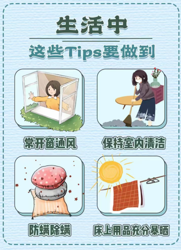2.室内要保持清洁,注意卫生死角,家里窗帘、布艺沙发、被子、地毯等要定期清洁,防止尘螨滋生,有条件可打开空气净化器;