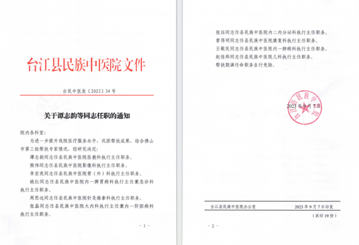 会上,袁进钧宣读了新一批帮扶专家任职文件及台江县民族中医院关于确定第四批师带徒人员名单的通知。