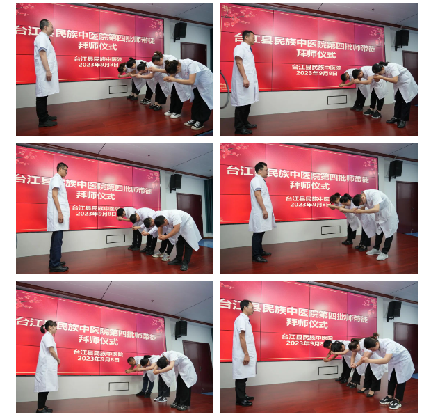 “素整衣冠、端身立正、拱手举过眉头,而后行三拜之礼,一拜师父收于门下,二拜师父传道、授业,三拜师父不厌其烦,谆谆教诲。礼成”。拜师仪式上,蒋开平院长与10位帮扶专家分别与其弟子逐一上台举行简单而又意义深远的拜师礼。