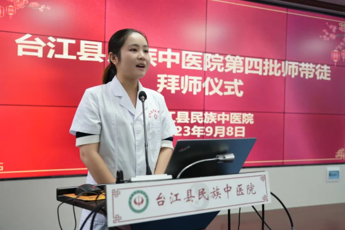 仪式上,黎平县中医医院肝肾脾胃病科副主任陈湘云作为蒋开平院长跟师弟子代表发言。她表示,特别荣幸成为蒋开平院长的跟师弟子并作为代表发言。她说“蒋院长是广东省的名中医、博士生导师、教授,有着特别丰富的临床经验,能够成为他的弟子、聆听他的教诲,得到他的指点,感受他的人格魅力,是我此生最幸运的事。相信在老师的精心培养下,我的中医水平必定能够上到新的台阶,成为一名优秀的中医人才。