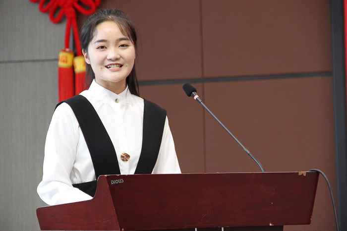 2021级专升本新生代表王萍萍发言。王萍萍同学表示,将与全体新生一起,在贵州医科大学校训“诚於己,忠于群,敬往思来”的引领下,带上理想和目标,带上自信和坚强,带上勤奋和努力,披荆斩棘,扬帆远航。