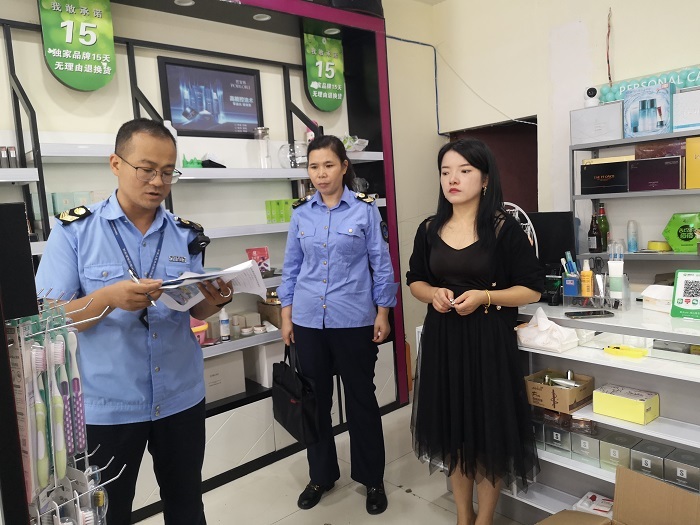 8月29日,开阳县卫健执法大队监督员杨天友(左一)等检查一美容店卫生