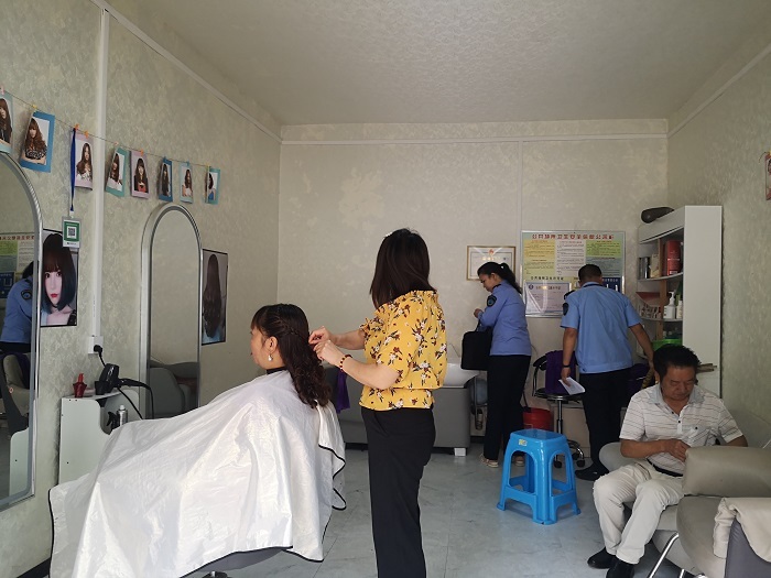 9月4日,开阳县卫健执法大队监督员杨光琴(左三)等检查会美造型理发店卫生