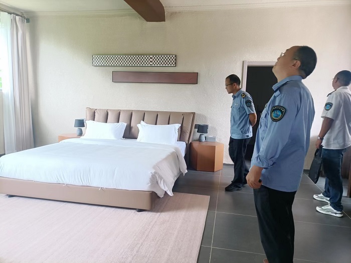 9月18日,开阳县卫健执法大队监督员胡学平(左二)等检查云録野奢旅店卫生