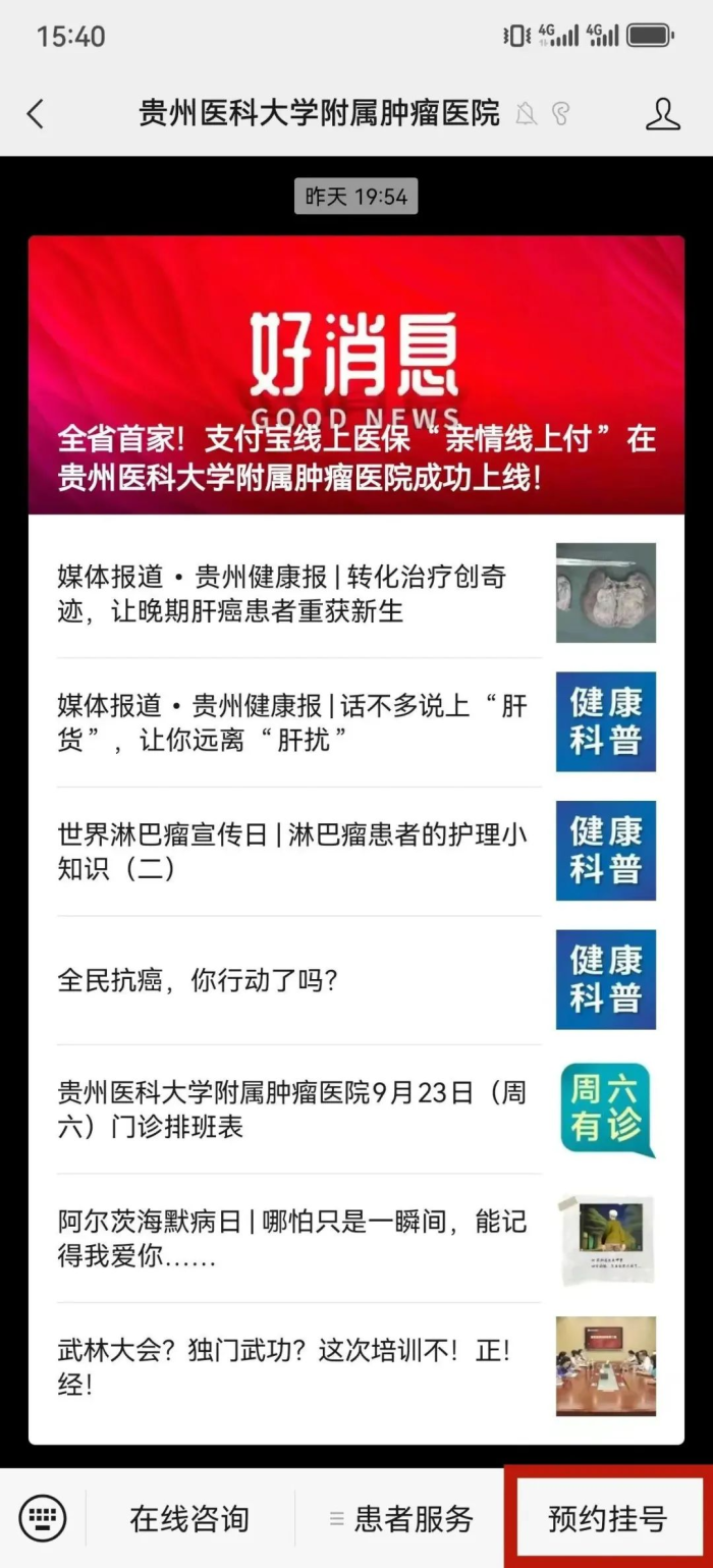 第一步:微信搜索“贵州医科大学附属肿瘤医院”公众号,点击右下方“预约挂号”