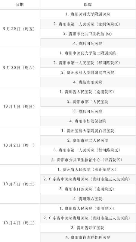首页 > 新闻中心 > 卫生工作动态 > 正文 国庆假期贵阳市各医疗机构值班安排来了! 来源:贵州健康报 时间:2023-09-26 浏览次数: 根据《国务院办公厅关于2023年部分节假日安排的通知》,为做好贵阳市国庆假期的医疗卫生服务工作,有效应对各类突发公共卫生事件,现就贵阳市国庆期间医院值班安排如下。一、值班顺序贵阳市卫生健康局2023年9月25日(来源:健康贵州)编 辑:向 烨二 审:毕 锋三 审:申 毅 分享到: