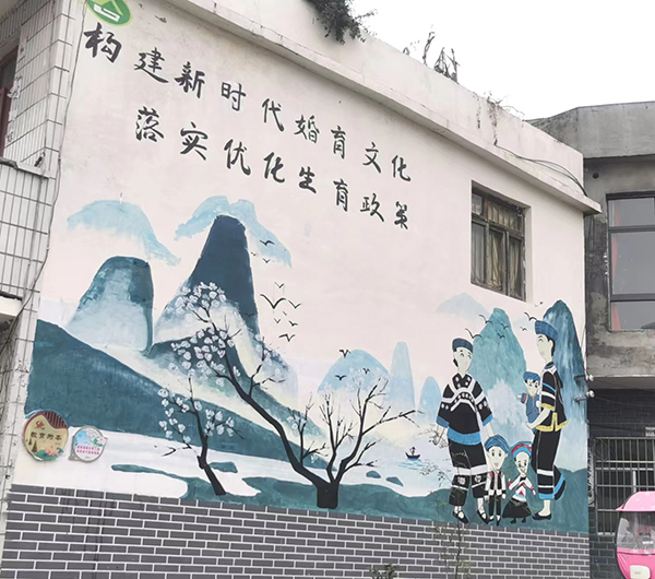 在龙里县计生协和翠微村村委会的共同努力下,杉木寨制作新时代婚育文化宣传主题墙1面,宣传长廊宣传标语7条,宣传山歌4首,宣传画3幅,宣传喷画6幅,路灯标识牌4个,卡通长凳3套,家风牌132个。寨子里处处可见新时代婚育文化宣传标语和绘画,成功打造了特色鲜明的“龙里·杉木”婚育文化品牌,营造了浓厚的新时代婚育文化宣传氛围。