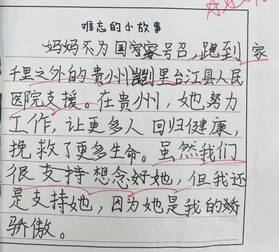 在台江支援期间,最令孟婧不舍的是家中的一双儿女。千里之遥,孟婧心中时时会涌起对孩子的思念和对家人的愧疚。几天前,儿子的语文老师把他写的小故事发到了孟婧的手机上,让她几度哽咽,留下了思念的泪水。