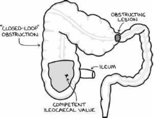 人体的肠道是一根连续的管道结构,肠梗阻是指各种原因导致的肠道通畅性中断,即肠道出现了堵塞或运行障碍,临床上常见的结肠梗阻原因为肿瘤、粪石堵塞所致。而闭袢性肠梗阻因为小肠与结肠连接处的回盲瓣的是一个单向阀,远端的完全阻塞导致中间肠段的持续压力升高,极易出现坏死穿孔。