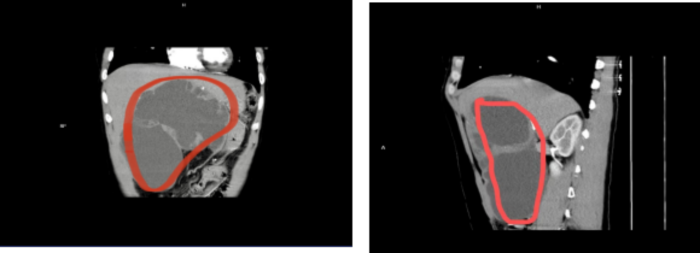 就在前不久,患者肚子突然剧烈地疼痛,便到毕节市第二人民医院普外科。通过腹部CT检查与临床经验的结合,最终诊断为“肝巨大占位性病变”,该肿物大小约173mm×78mm×184mm。