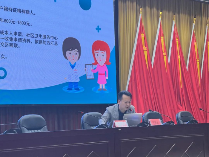 会上,区民政局工作人员龙海英就严重精神障碍患者的“以奖代补”政策、低保准入条件、特困供养人员的评估认定及救助待遇、特殊案例、政策咨询渠道等展开介绍;区医保局工作人员杨文对2024年城乡居民医保的缴费期限、申请方式、待遇水平、报销方式等进行了讲解;区残联工作人员聂夫光围绕区残联针对精神类残疾人提供的住院救助、服药救助、护理补贴等优惠政策展开详细讲述;区公安分局治安大队熊小利向在场与会人员分享了涉精神障碍患者警情处置案例;区疾控中心严重精神障碍管理工作人员周文杰向在场人员介绍了患者筛查流程、各个部门在信息交换中的工作要求等;贵州省第二人民医院精防科科长白蝉讲述了在随访过程中与精神障碍患者接触、沟通交流的基本原则和技巧。会议最后,各部门向与会的基层工作人员提供了咨询电话,并进行现场答疑,为下一步明确职责分工、加强信息共享建立基础。