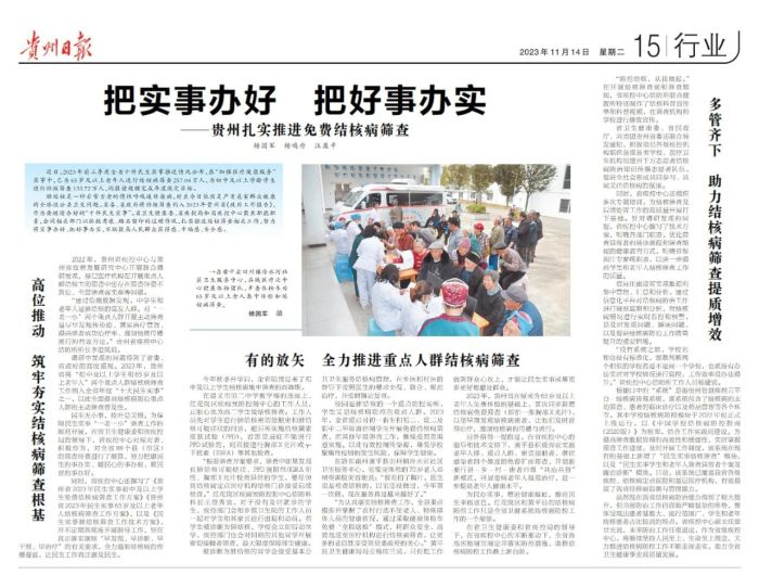 11月14日,《贵州日报》行业版发表标题为《把实事办好 把好事办实——贵州扎实推进免费结核病筛查》文章,天眼新闻同步推送,聚焦省卫生健康委、省疾控局和省疾控中心会同相关部门扎实推进结核筛查相关工作,不断提高人民群众获得感、幸福感、安全感。具体报道如下:
