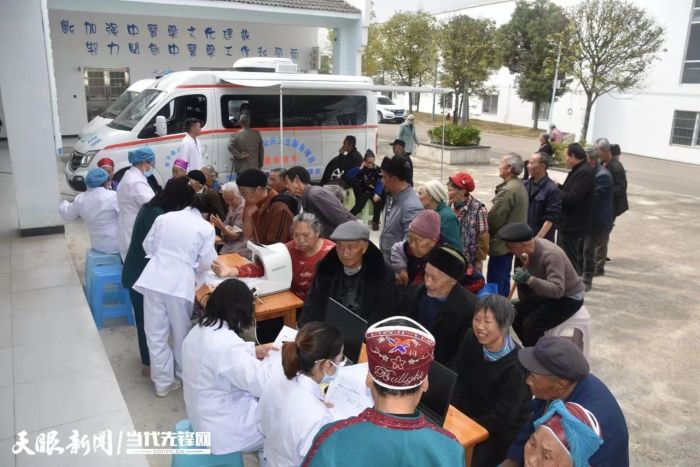 在黄平县旧州镇冷水河社区卫生服务中心,县域医疗次中心健康体检团队,开着体检车为65岁及以上老人集中体检和结核筛查