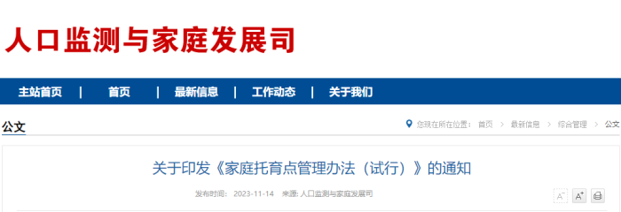 11月16日,国家卫生健康委发布关于印发《家庭托育点管理办法(试行)》的通知,《办法》中提到:
