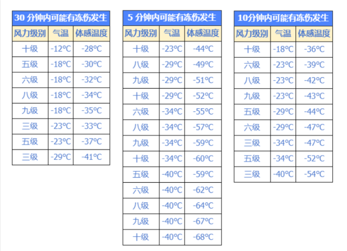 风力级别越高,身体热量流失速度越快,皮肤温度越低。风力级别很高时,即使气温不是特别低,冻伤等严重的天气相关健康问题也更可能发生。不同风力级别和气温时的体感温度和可能发生冻伤的时间见上表。