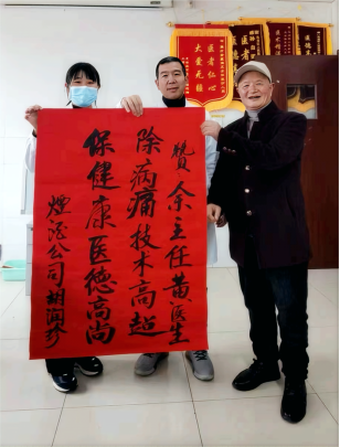 入院后,胡阿姨接受了神经射频治疗,经过科室制定的综合治疗,不仅症状得到了有效缓解,疼痛也逐步消失。在康复之际,胡阿姨感慨万分,请求老伴将自己的心境化作墨宝,挥洒墨汁于纸上,表达对医生团队的深深感激:“除病痛技术高超 保健康医德高尚”。