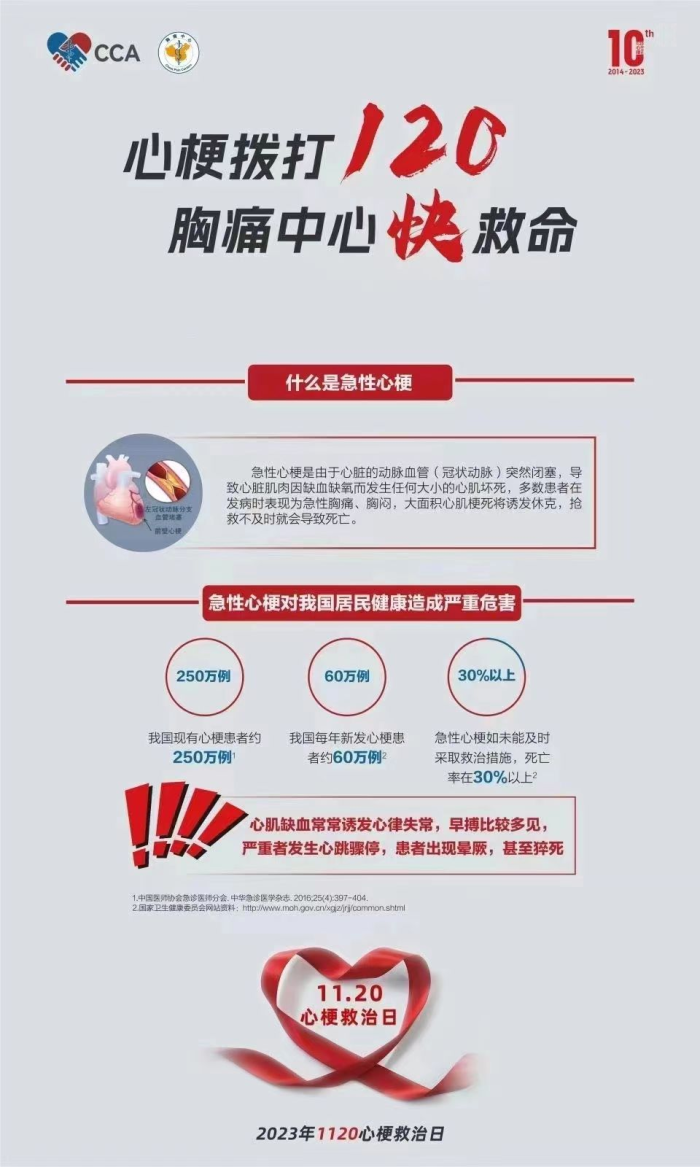 1120寓意有两个:一是“有胸痛,我要拨打120”;二是“心梗救治,争取黄金120分钟”。2023年11月20日,是心梗救治日十周年,由胸痛中心专家委员会、心血管健康研究院主办“心梗拨打120,胸痛中心快救命”的主题活动,号召各胸痛中心建设单位及广大医疗卫生工作者积极参与。