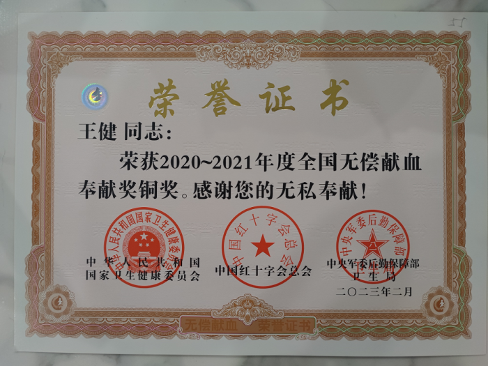 加入骨髓库,并不等于捐献。要知道,目前造血干细胞配型成功的概率为几万至十几万分之一不等,每一位自愿加入中华骨髓库的志愿者都将面临几个月甚至几年的漫长等待期,王健也不例外。与此同时,王健也积极投身参与到无偿献血事业中来,主动捐献全血和成分血,直至今天王健无偿献血累计次数达20次,献血量达4100ml,荣获“2020-2021年度全国排无偿献血奉献奖铜奖”。