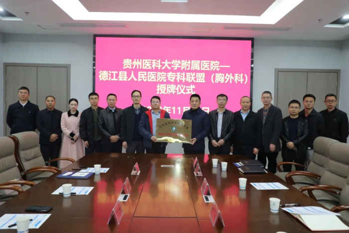 贵州医科大学附属医院胸外科主任李剑与德江县人民医院院长田永松签订专科联盟协议,并授予德江县人民医院“贵州医科大学附属医院胸外科专科联盟成员单位”牌匾。
