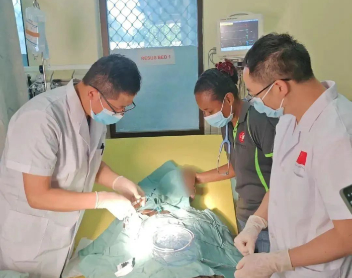 5月29日,援所中国医疗队队员、贵州医科大学附属医院心血管内科专家司晓云,援所中国医疗队队员、贵州医科大学附属医院泌尿外科专家肖跃海紧急协助所罗门群岛国家转诊医院抢救一名心动过缓患者,在缺乏X线透视引导的情况下,将临时起搏器一次植入到位,成功挽救患者生命